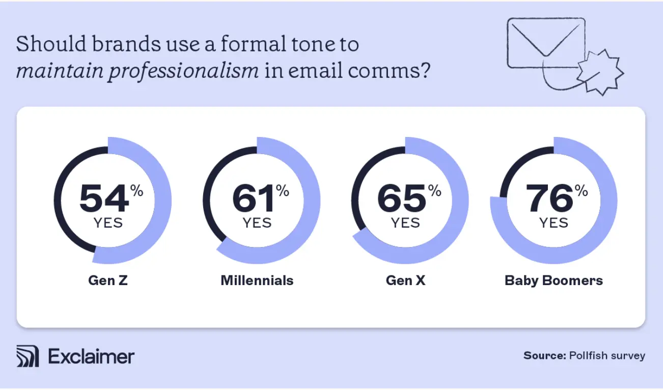 Snapshot: Exclaimer's survey found that 83% of consumers across all age groups prefer a formal tone in communications from finance and healthcare brands. Despite the trend towards casual language in some sectors, the majority of Gen Z, Gen X, and Baby Boomers agree that formal language is crucial for finance.