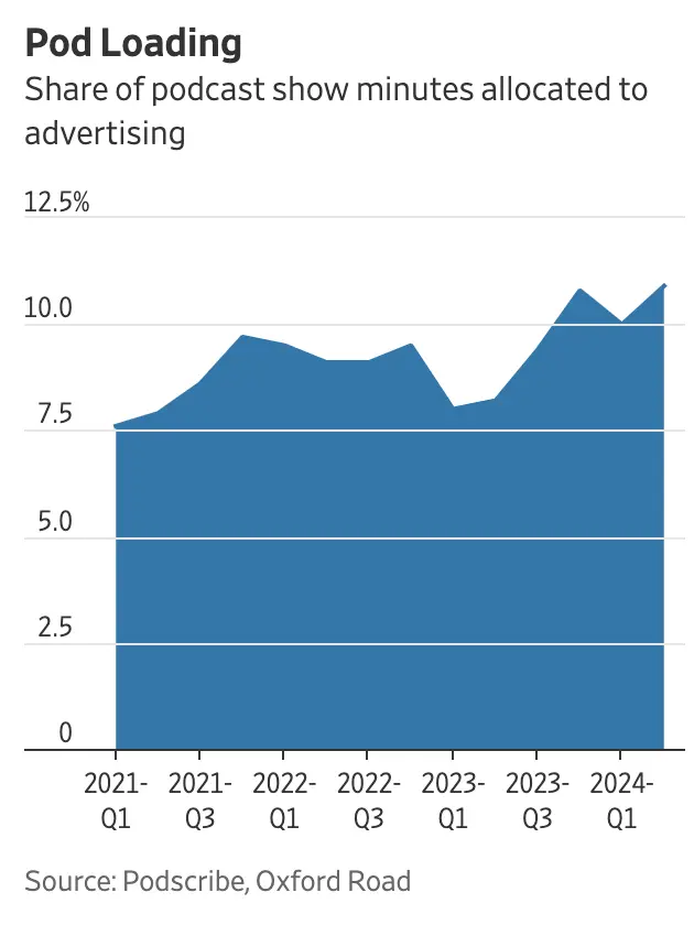 Key Stat: Ads in podcasts accounted for 10.9% of total runtime in Q2 2024, up from 7.9% in Q2 2021, indicating a growing trend towards monetization through increased advertising.