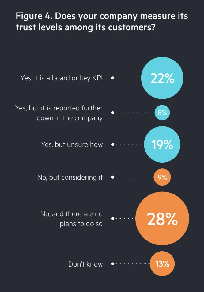 At the same time, fewer than half of companies actively measure trust or treat it as a board-level KPI, even tho