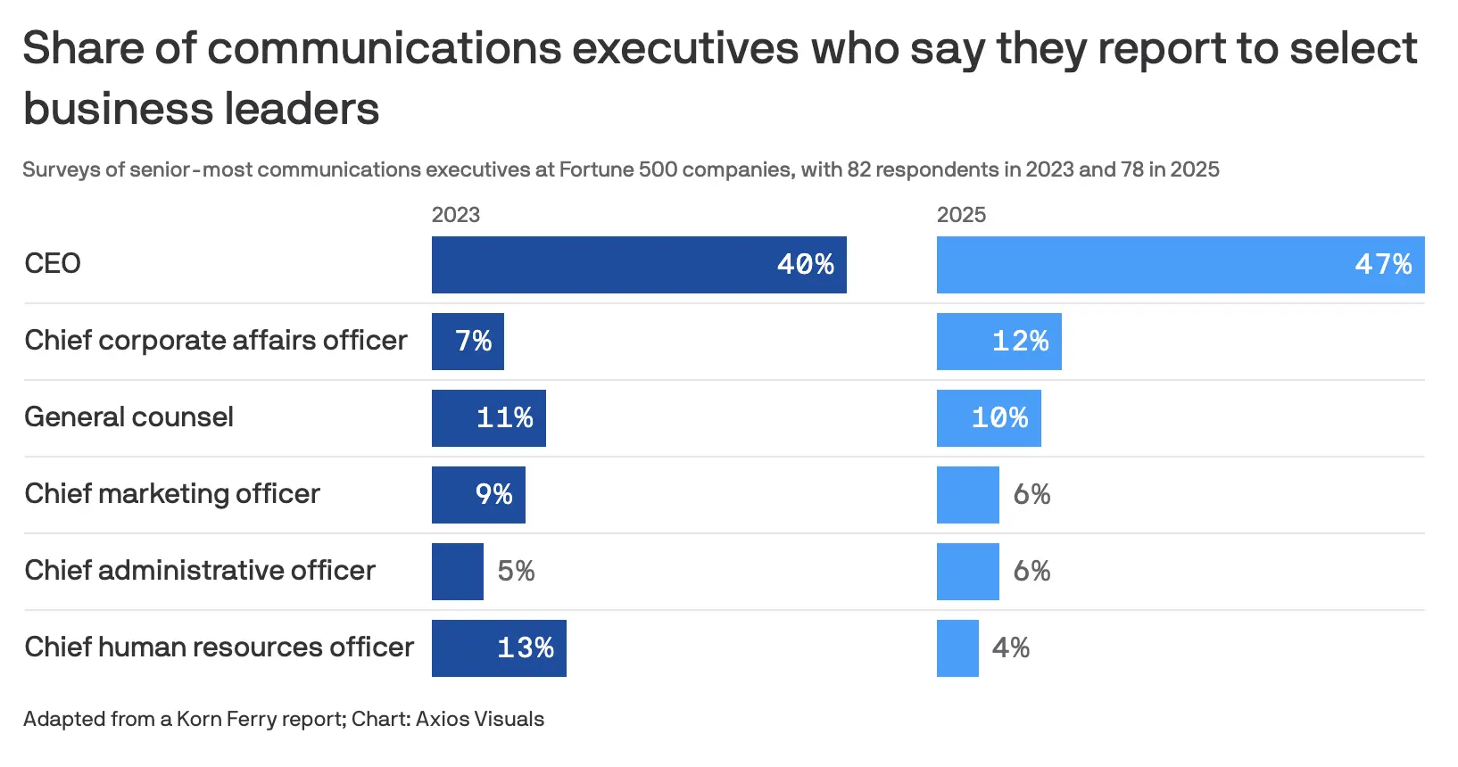Korn Ferry’s 2025 survey of Fortune 500 communications leaders shows nearly half now report directly to the CEO, up from 40% in 2023, underscoring the role’s growing strategic importance. More than half of respondents sit on executive committees, marking a clear shift from communications as a support function to a leadership discipline tied to enterprise value.