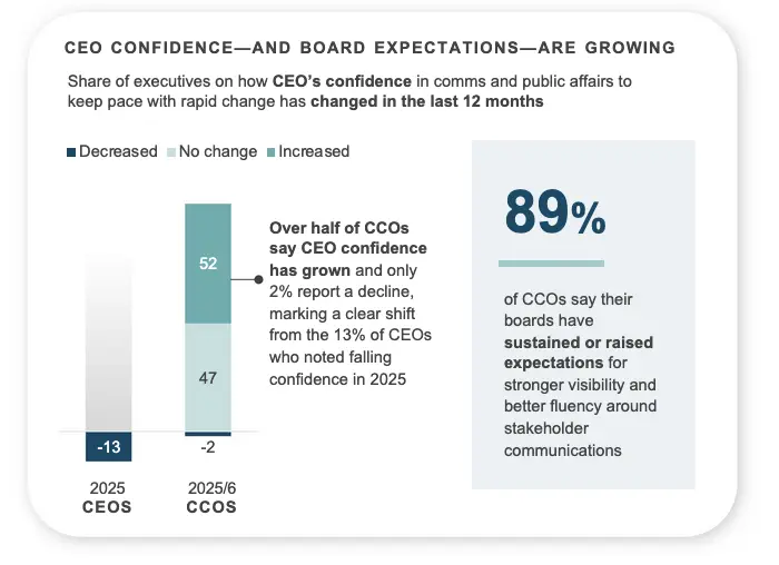 A new Weber Advisory study conducted with Gravity Research finds the confidence gap between CEOs and their communications teams is narrowing significantly, with more than half of communications executives reporting their CEO's confidence in the function has grown over the past 12 months while only 2% report decreased confidence, down sharply from 13% in 2025.