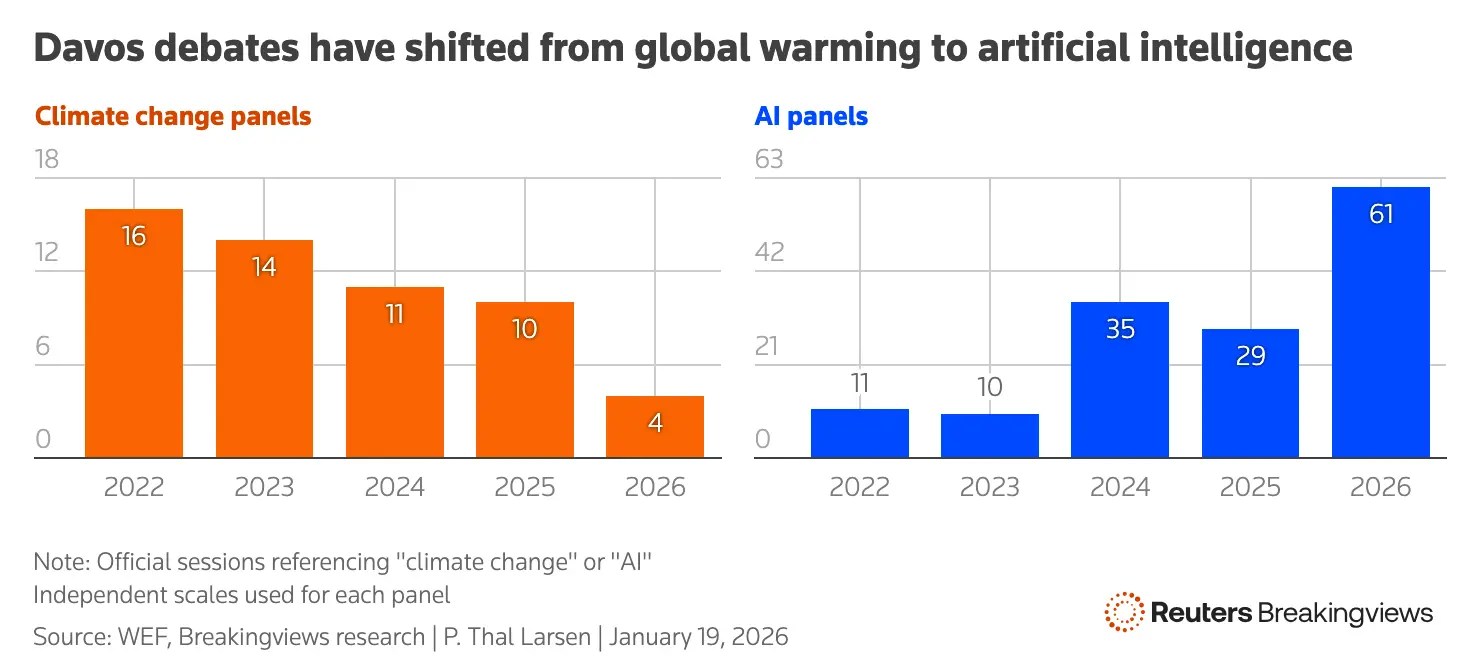 Reuters' Peter Thal Larsen observes that this year's WEF has embraced discussions of technology, deals, and realpolitik. The organization's risk-perceptions survey now lists economic confrontation, misinformation, and societal polarisation as the most pressing problems, a change from previous years when environmental issues topped the list.