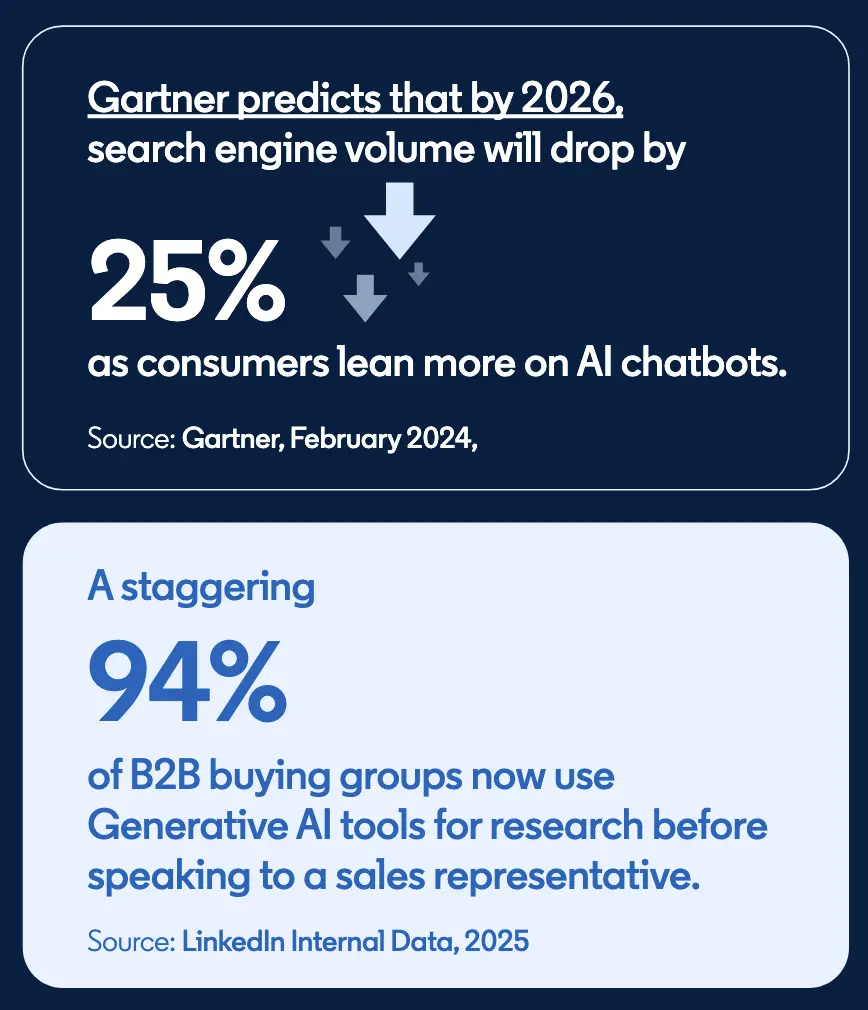 LinkedIn published a practical guide for optimizing owned content for AI search as Gartner predicts search engine volume will drop 25% by 2026 and 94% of B2B buying groups now use generative AI tools for research before speaking to a sales representative.
