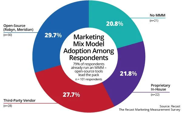 Recast cofounder Michael Kaminsky argued that marketing leaders do themselves a disservice by offering false precision when they don't actually know, and warned against leaning on LLMs for measurement support because the technology tends to construct the story it thinks the user wants to see. On the tools side, roughly 30% of respondents use open-source MMMs like Meta's Robyn or Google's Meridian, 28% use a third-party vendor, and about 21% don't use any marketing-mix model at all.