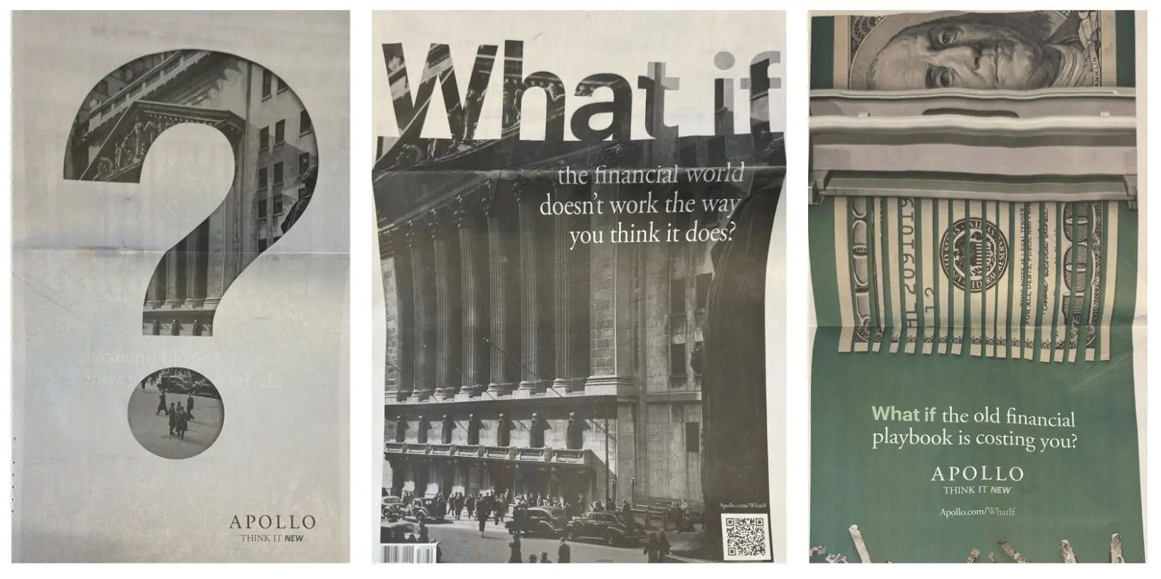 A new campaign from Apollo promoted through a Wall Street Journal cover wrap directs readers via QR code to a landing page titled "What If the World Doesn't Work the Way You Think It Does?" The page challenges the durability of the current portfolio thinking and makes the case for private credit and alternatives as a structural part of modern portfolio construction. The wrap and long-scroll page sends a 100 dollar bill and a portion of the text through a shredder.