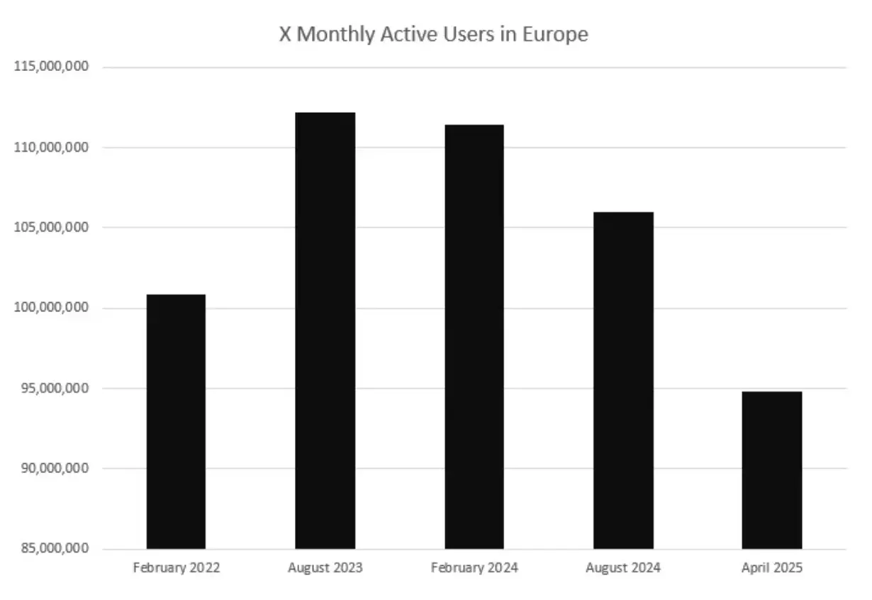 Despite the decline, X remains above the 45 million EU user threshold that would trigger additional regulatory requirements.