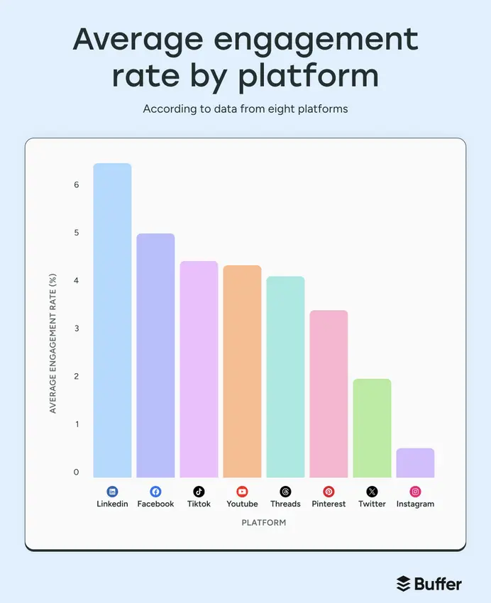 Social media engagement rates are reshuffling the deck in 2025, with LinkedIn emerging as the top platform for active interaction. Buffer’s latest cross-platform analysis reveals LinkedIn’s average engagement rate leads at 6.5%, beating TikTok, Facebook, and YouTube.