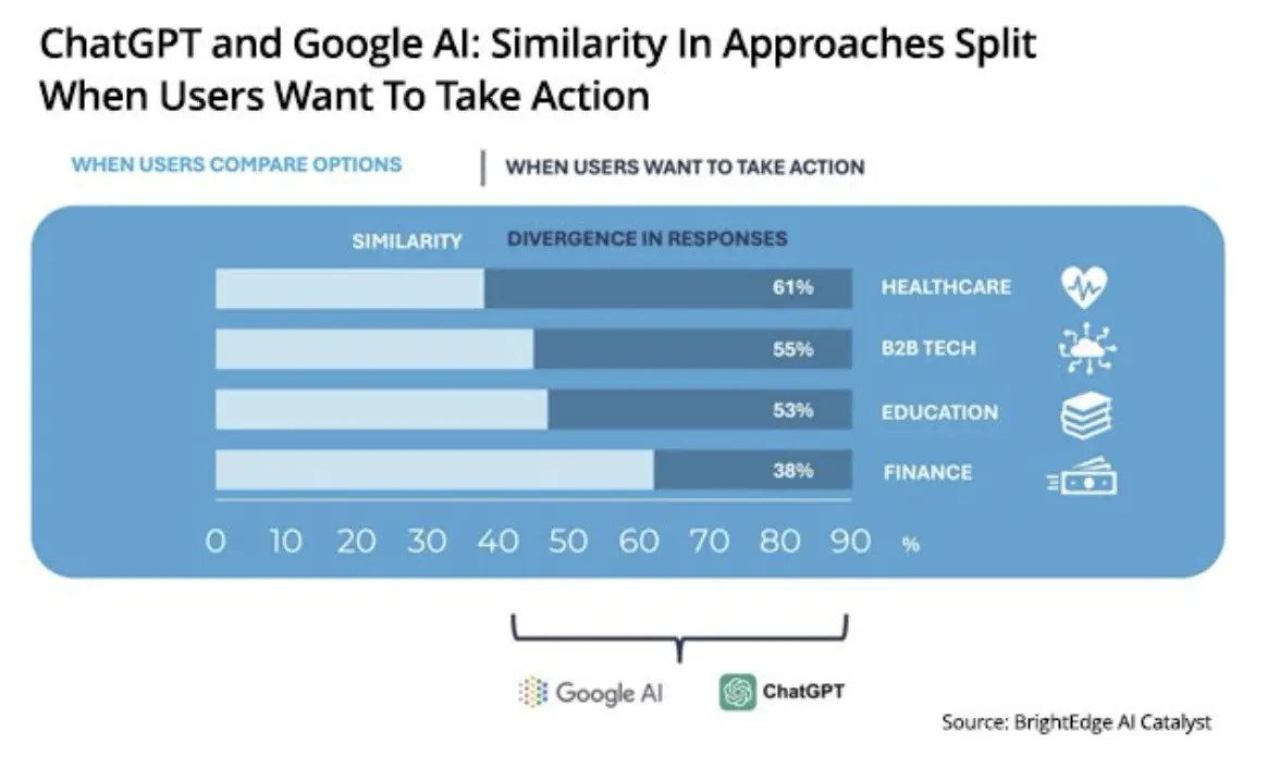 BrightEdge data confirms a deepening split in AI search philosophy: Google acts like a research assistant, surfacing sources, while ChatGPT behaves like a trusted coach, recommending tools and next steps. In finance, this divergence is subtle but still significant.