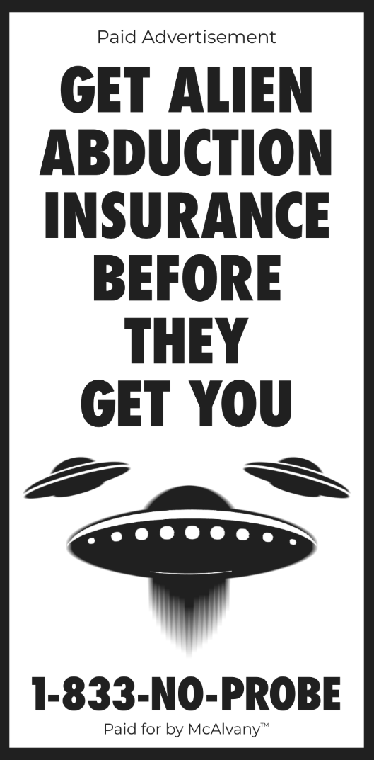 McAlvany Financial Group followed its “Wealth Insurance” push with a classified-style curveball in the New York Times and Wall Street Journal: “GET UFO ABDUCTION INSURANCE BEFORE THEY GET YOU,” plus a phone number and a tiny logo.